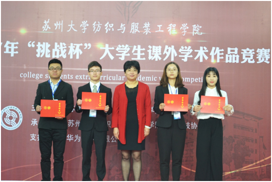 在紧张的答辩环节结束后,结合答辩汇报和书面审评,最终4组团队斩获了特等奖,6组团队赢得了一等奖,12组团队赢得了二等奖,23组团队获得三等奖,另有3组团队获得了单项奖。学院领导及评委老师为获奖的队伍颁奖并和获奖团队合影留念。本次竞赛中涌现出一批努力钻研、奋勇创新的学生,他们为科研注入新鲜的活力,以梦为马,剑指未来,书写了属于他们也属于纺院的靓丽篇章。